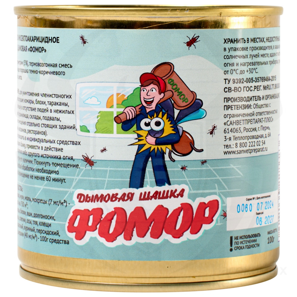 Препарат Фомор представляет собой дымовую шашку, которая за счет дыма уничтожает насекомых. После этого их поражает действующее вещество, от чего они погибают. Действие инсектицидной шашки весьма простое и не требует выполнения сложных манипуляций. Общий вес банки вместе с упаковкой составляет 100 грамм.