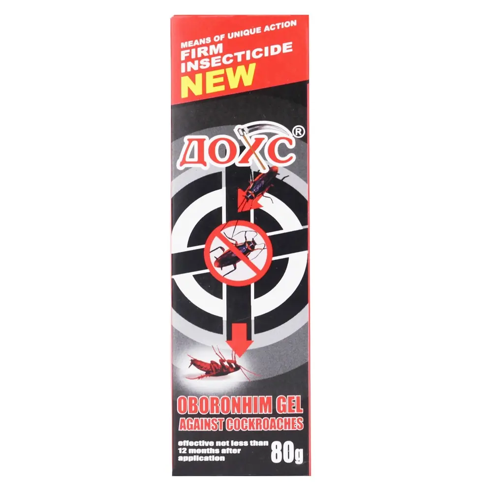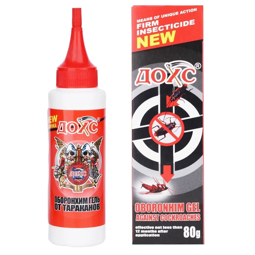 ДОХС гель от тараканов и муравьёв — готовое к применению инсектицидное средство в форме плотного геля белого цвета. Благодаря удобной тубе с удлинённым носиком препарат легко наносится даже в самые труднодоступные места — за плинтусы, в щели, вентиляционные шахты. Гель не стекает с вертикальных поверхностей и сохраняет свою эффективность до трёх лет с момента выпуска. Он не имеет резкого запаха, не привлекает домашних питомцев и легко смывается водой. При этом замедленное действие активного вещества позволяет отравленной особи вернуться в гнездо и заразить всю колонию, включая личинок.