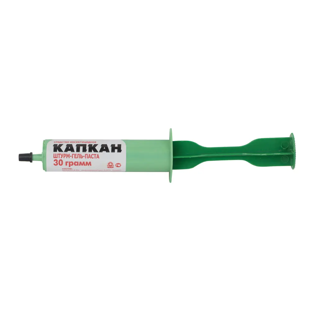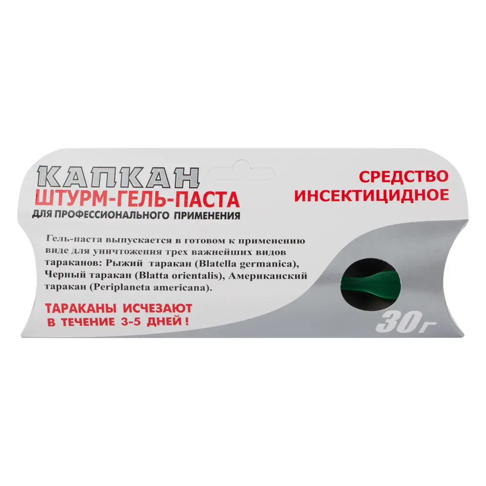 Купить Капкан штурм-гель-пасту вы можете в универсальной тубе по типу шприца. Каждая упаковка содержит 30 г вещества, чего достаточно для полного уничтожения колонии тараканов небольшой численности.