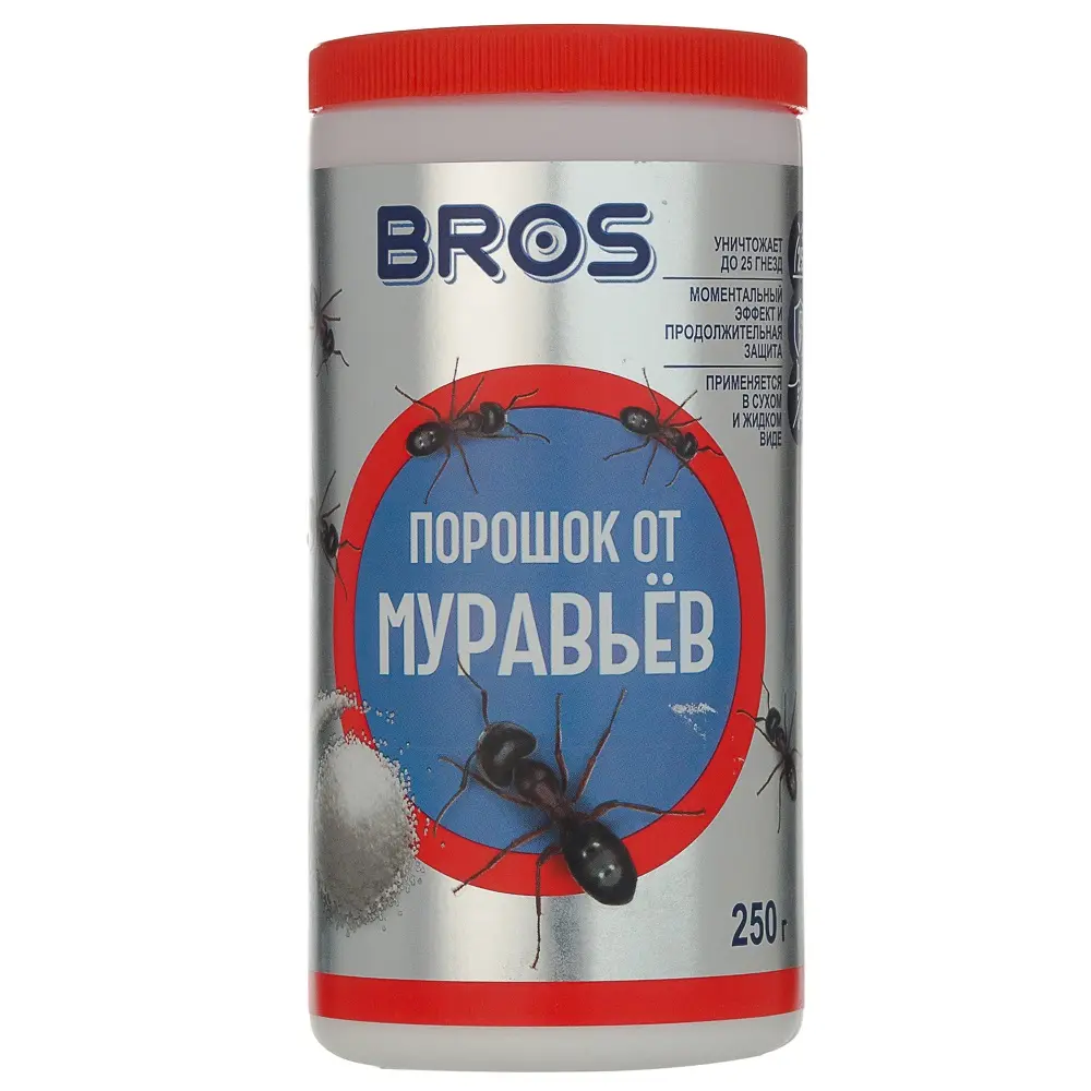 Bros порошок от муравьев — простой и эффективный инсектицидный препарат контактного действия на основе хлорпирифоса 2%. Может использоваться в виде порошка или водного раствора. Всего одна обработка — и муравейник будет полностью уничтожен!