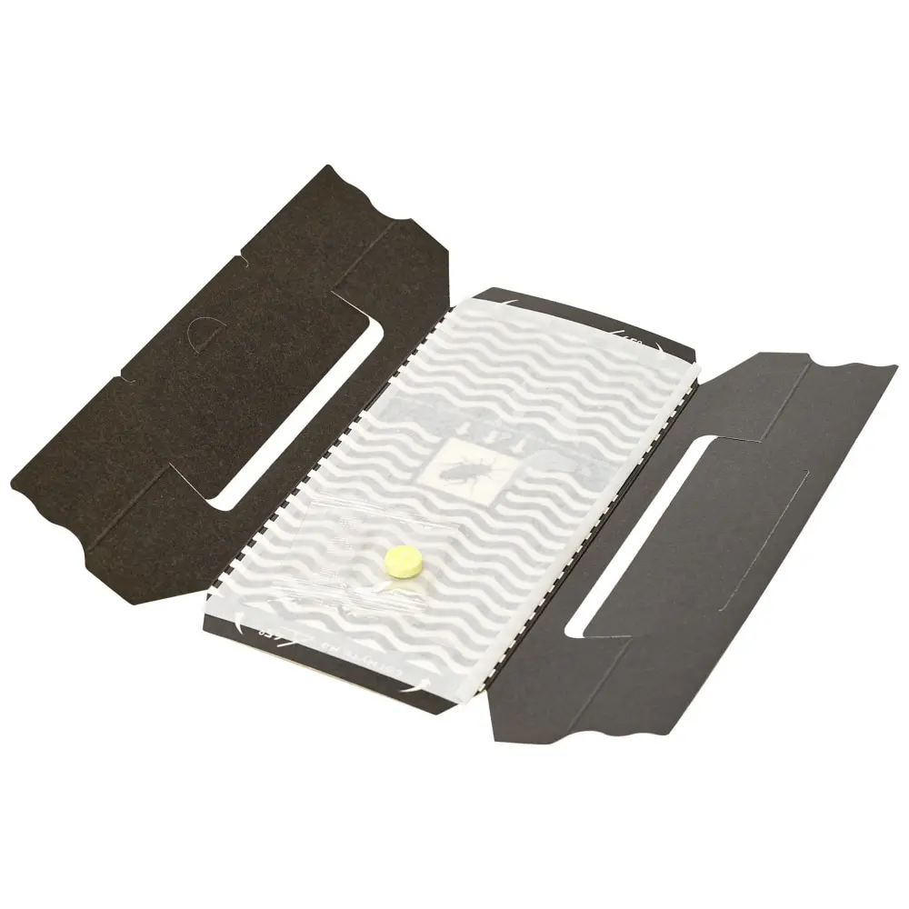 - Высокая эффективность: клеевая основа надёжно удерживает даже самых подвижных насекомых, а привлекательная таблетка-приманка действует на расстоянии до 5 метров.