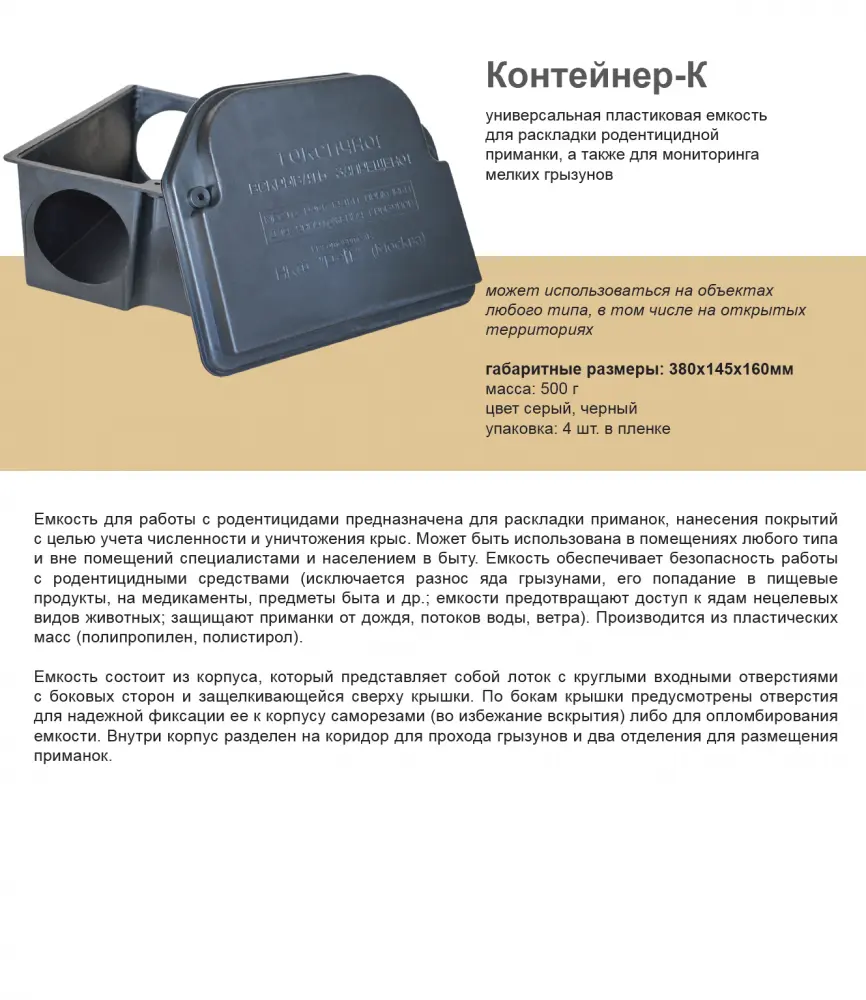 Приманочная станция "Контейнер К" - удобный и недорогой способ борьбы с грызунами. Контейнер экологичен и предназначен для многоразового использования.
