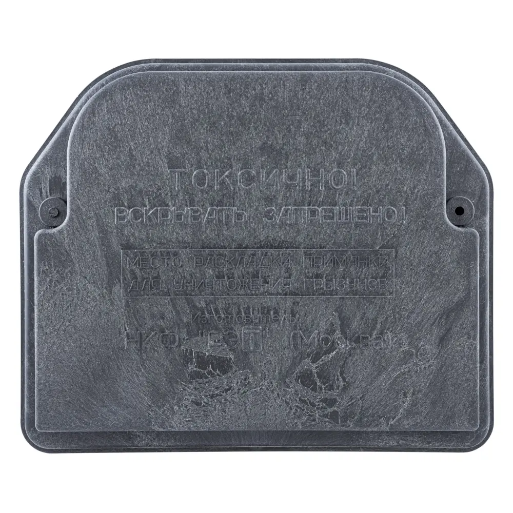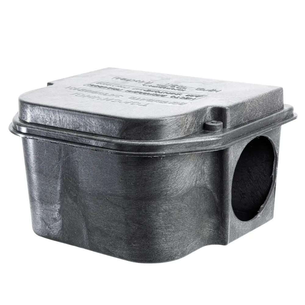 Продуманная конструкция и надёжное крепление крышки исключают проникновение внутрь контейнера нецелевых видов животных и домашних питомцев, предотвращают растаскивание приманки грызунами и её размывание при размещении на открытом воздухе.