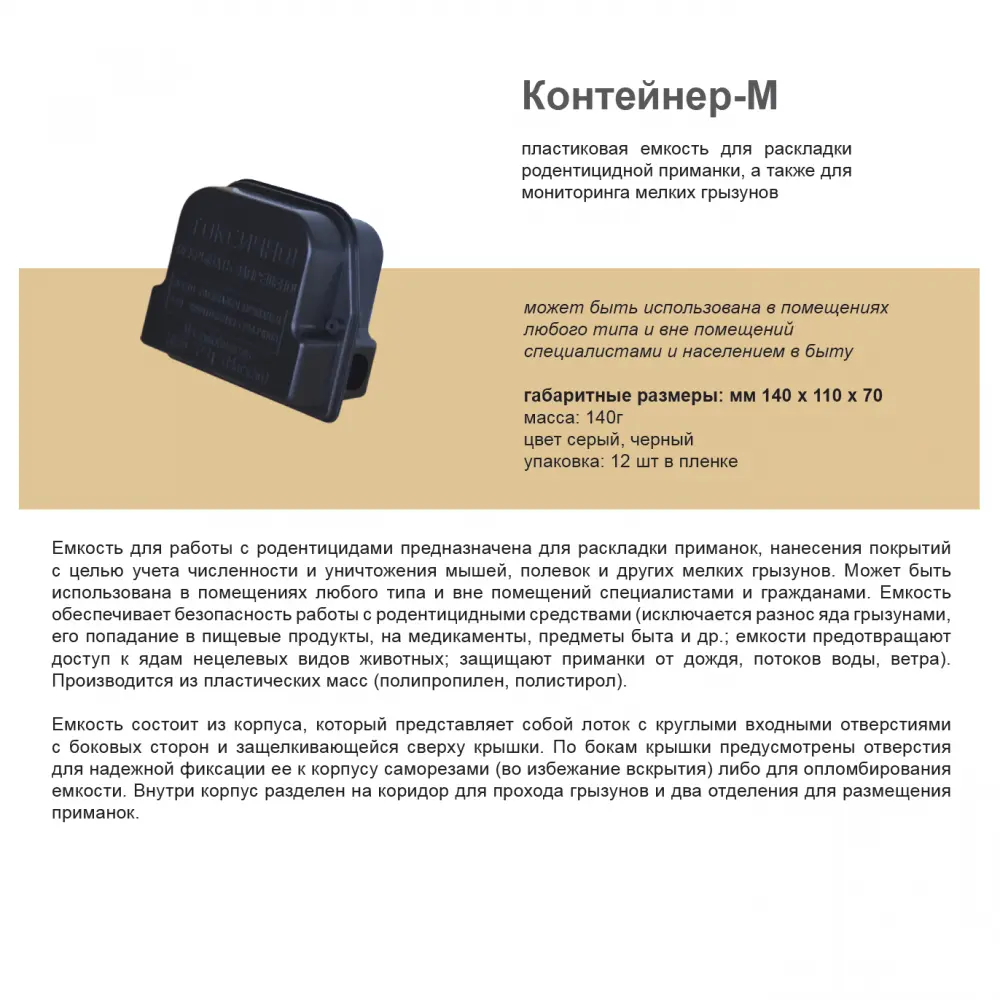 Контейнер М — пластиковый контейнер чёрного цвета с габаритными размерами 140×110×70 мм и весом 140 грамм. Производство: Россия. Контейнер снабжён двумя отверстиями для входа и выхода грызунов. Внутри расположен «коридор» для перемещения грызунов и два отсека для приманки и/или родентицидных смесей. Крышка ёмкости плотно прилегает к основанию и может быть дополнительно зафиксирована саморезами (предусмотрены специальные отверстия). Надёжное крепление исключает случайное открытие и защищает отравленную приманку от поедания домашними питомцами.