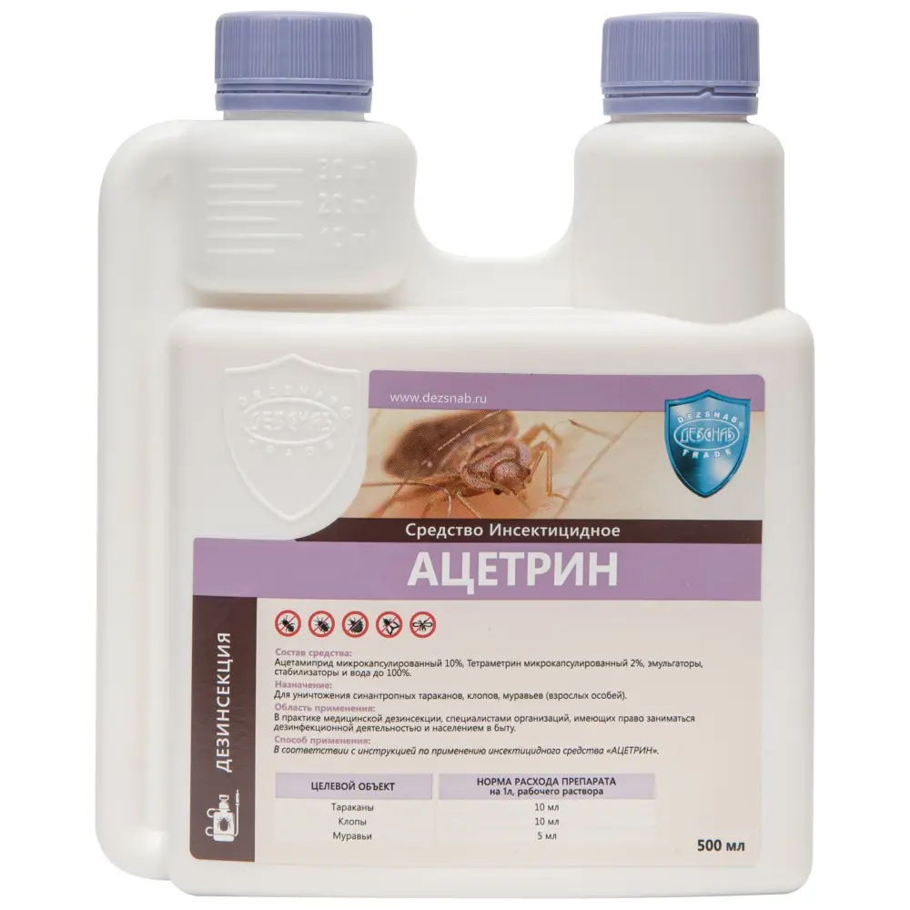 Для борьбы с этими вредителями ООО «Дезснаб-Трейд» разработало эффективное средство – Ацетрин. Это концентрат эмульсии бежевого цвета без резкого запаха, расфасованный в полиэтиленовые флаконы ёмкостью 500 мл. Остаточное действие препарата сохраняется до 14 суток.