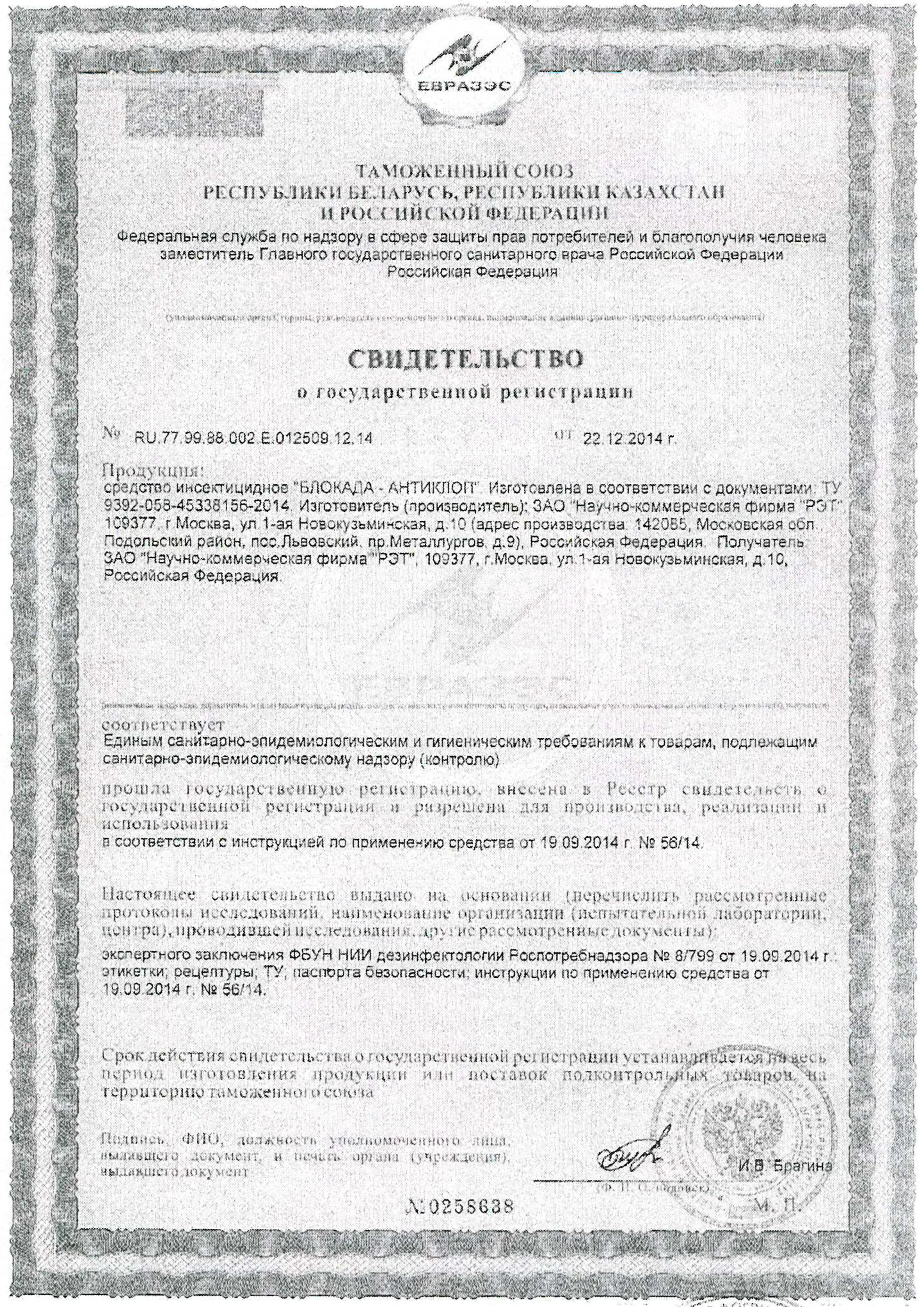 Блокада-Антиклоп относится к 3 классу опасности при введении в желудок (умеренно опасное вещество) и к 4 классу при нанесении на кожу (малоопасное). Все работы проводите в средствах индивидуальной защиты: защитный костюм, резиновые перчатки, очки и респиратор. На время обработки удалите детей и домашних животных, запрещается пить, курить и принимать пищу. После завершения снимите СИЗ, вымойте лицо и руки с мылом, примите душ. Хранить в темном, сухом, прохладном месте отдельно от лекарств и пищевых продуктов.