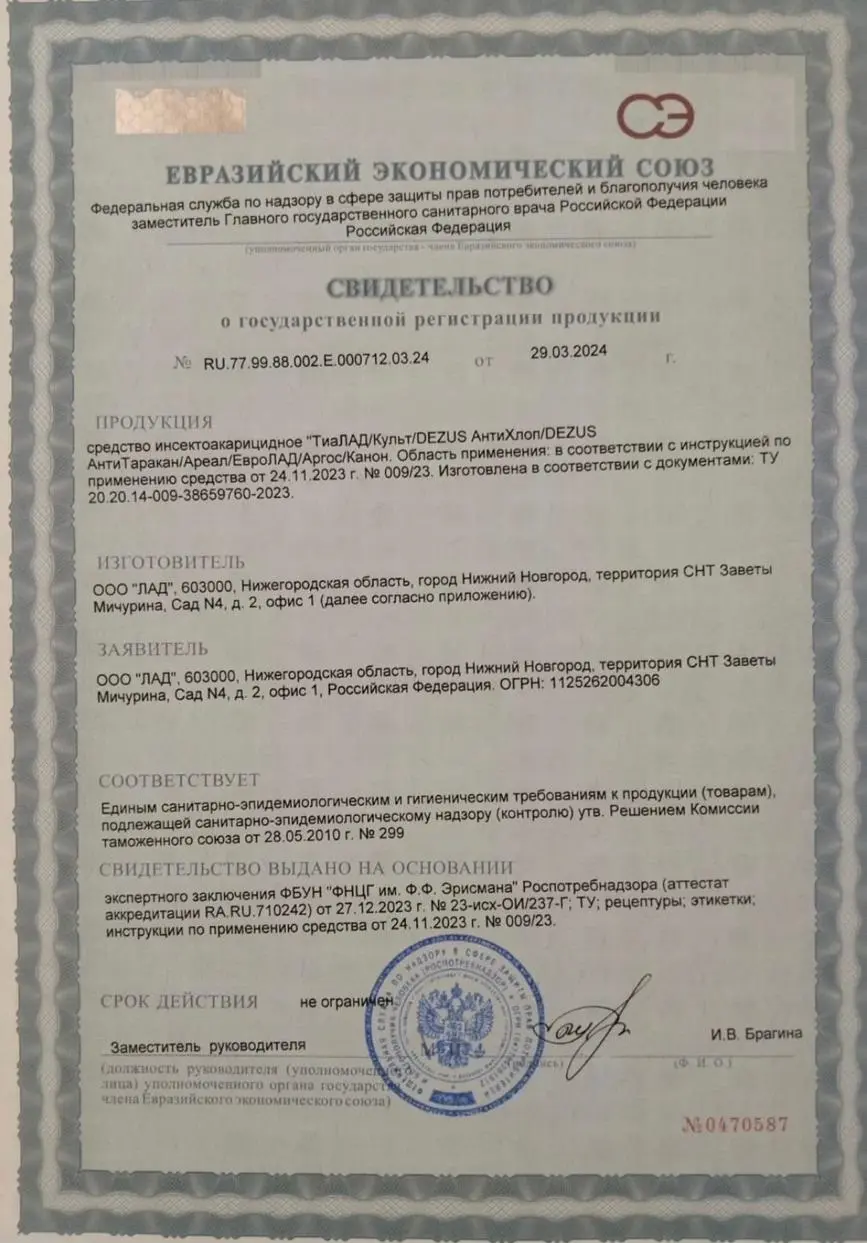 Dezus (Дезус) Антихлоп предназначен для уничтожения тараканов, клопов, блох, муравьёв и других ползающих насекомых в жилых и нежилых помещениях: