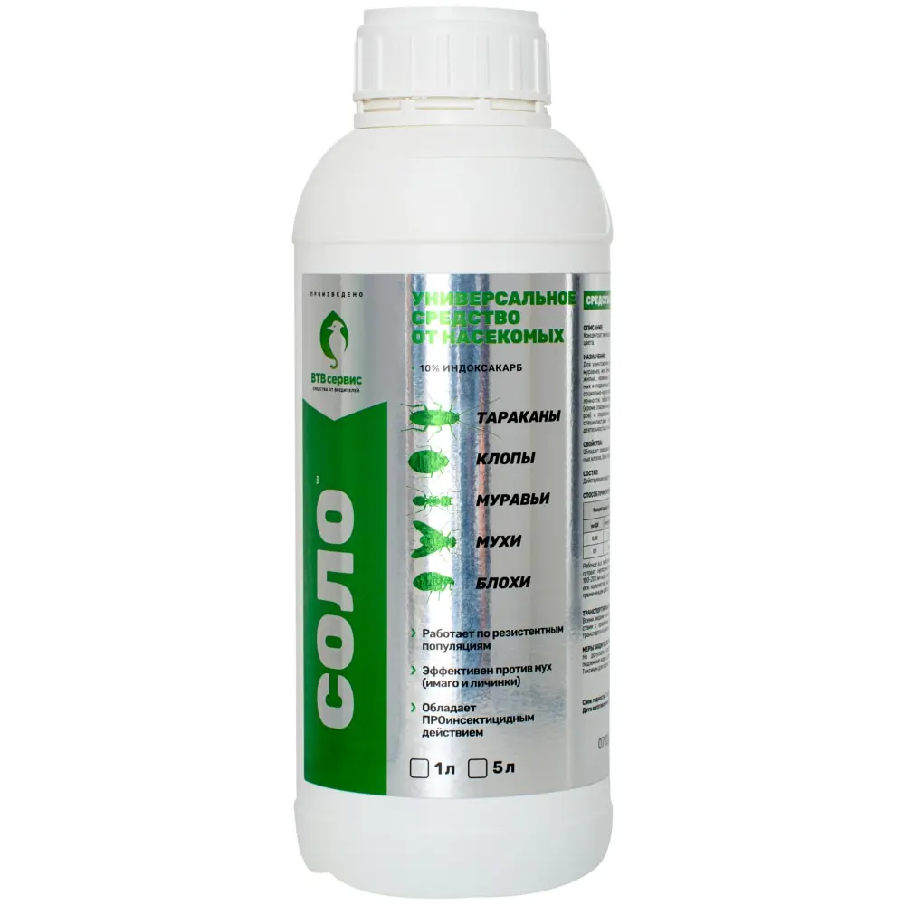 «Соло» – это инсектицидное средство широкого спектра действия, выпускаемое в удобной форме концентрированной жидкости объемом 1 литр. Продукт предназначен для уничтожения синантропных (обитающих в жилище человека) насекомых, таких как постельные клопы (Cimex lectularius), рыжие тараканы (Blattella germanica), черные тараканы (Blatta orientalis), блохи (Siphonaptera spp.) и домовые муравьи (Lasius niger и другие виды).