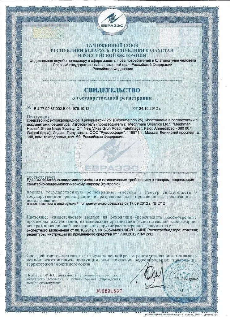 Принцип действия: активный компонент препарата – циперметрин. Попадая в организм насекомого, связывается с липофильным окружением мембраны. Это становится причиной деполяризации мембраны и сильного замедления работы натриевого канала. Нервная система личинок и взрослых особей парализуется, а через некоторое время наступает летальный исход.