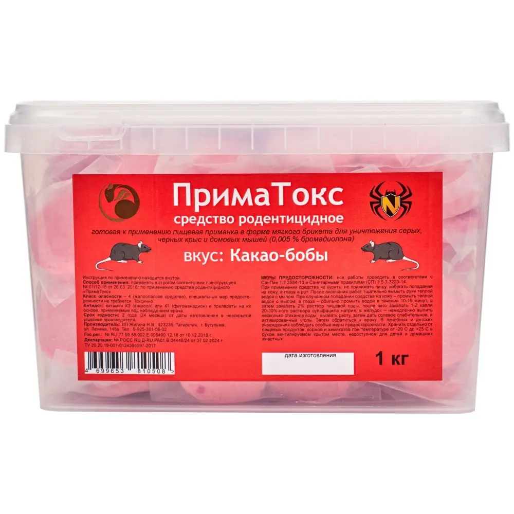 ПримаТокс отрава от грызунов, крыс и мышей (мягкие брикеты) (какао-бобы), 1 кг