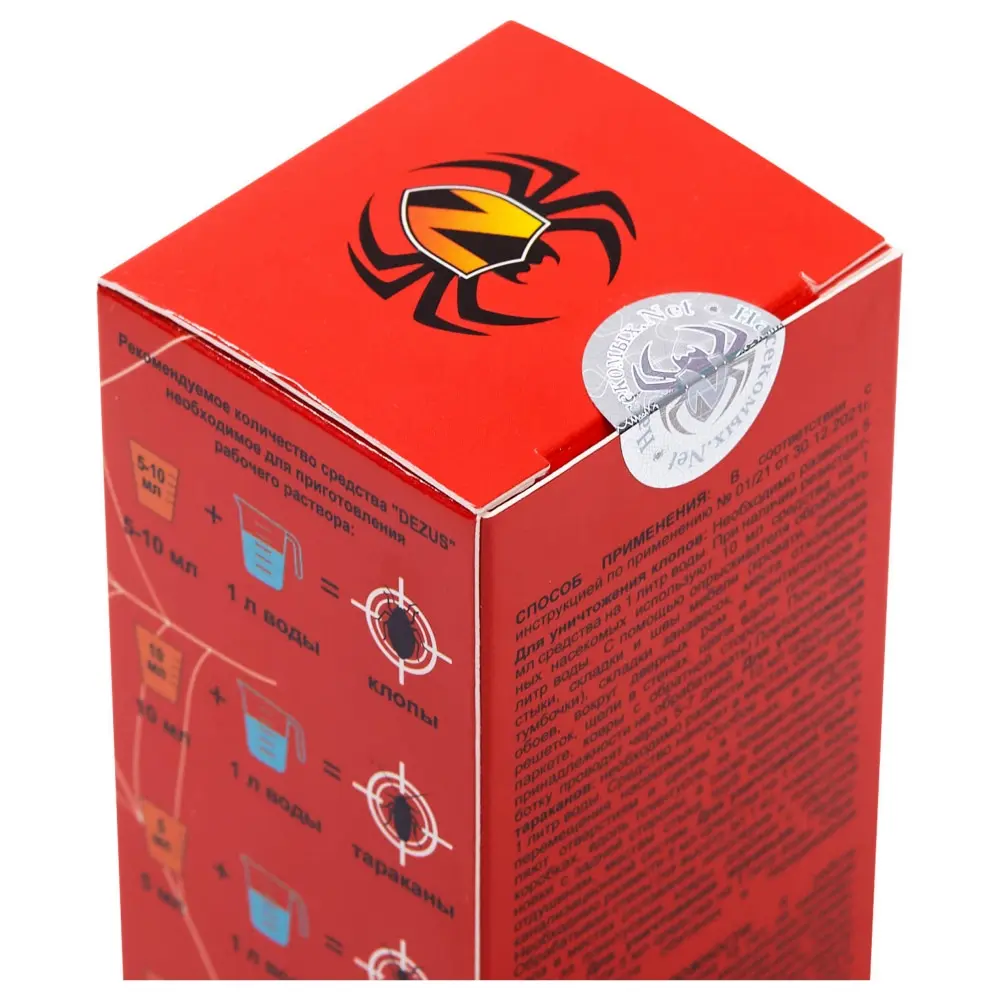 «DEZUS» — универсальное средство для уничтожения насекомых в виде бесцветной концентрированной эмульсии с резким запахом. Выпускается в пластиковых флаконах с голограммой емкостью 5 мл, 100 мл, 500 мл и 5 литров.