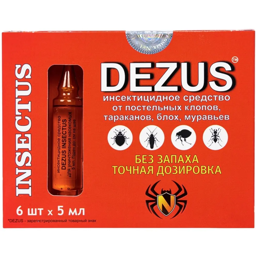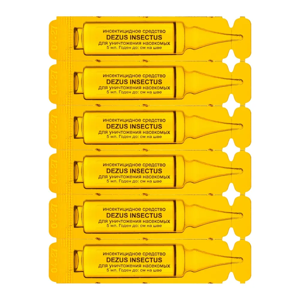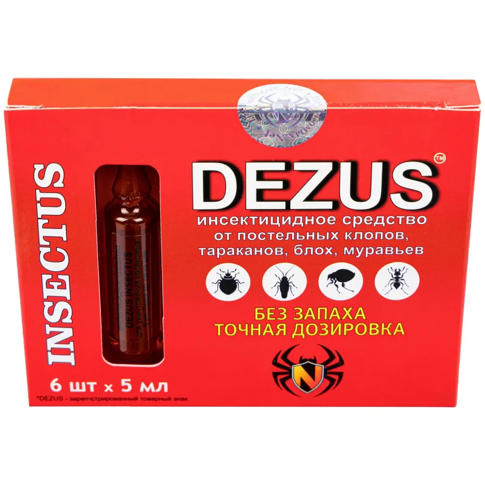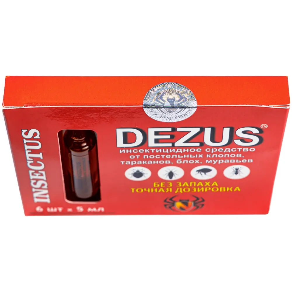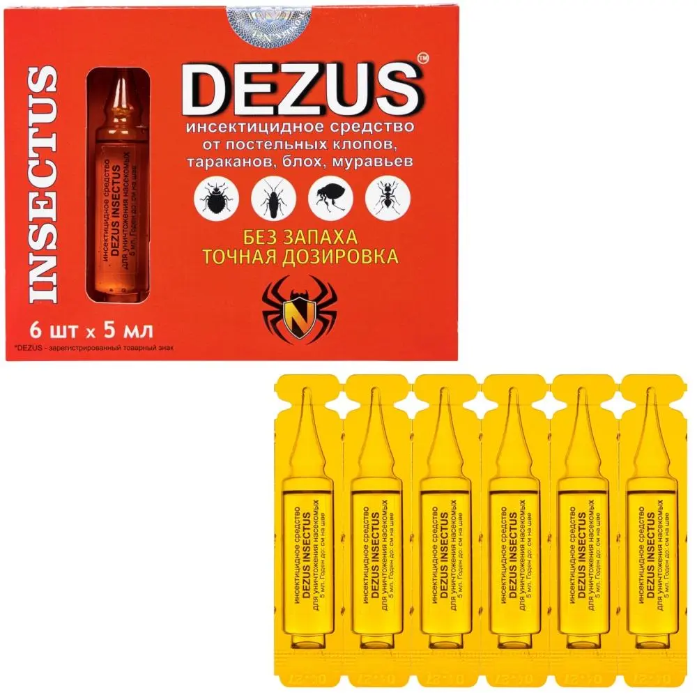 Dezus – универсальный инсектицидный продукт. В упаковке 6 ампул по 5 мл. Препарат контактно-кишечного действия попадает в организм паразитов через хитиновые покровы и пищеварительную систему. Ампулы содержат концентрированное отравляющее вещество, предназначенное для разведения водой.