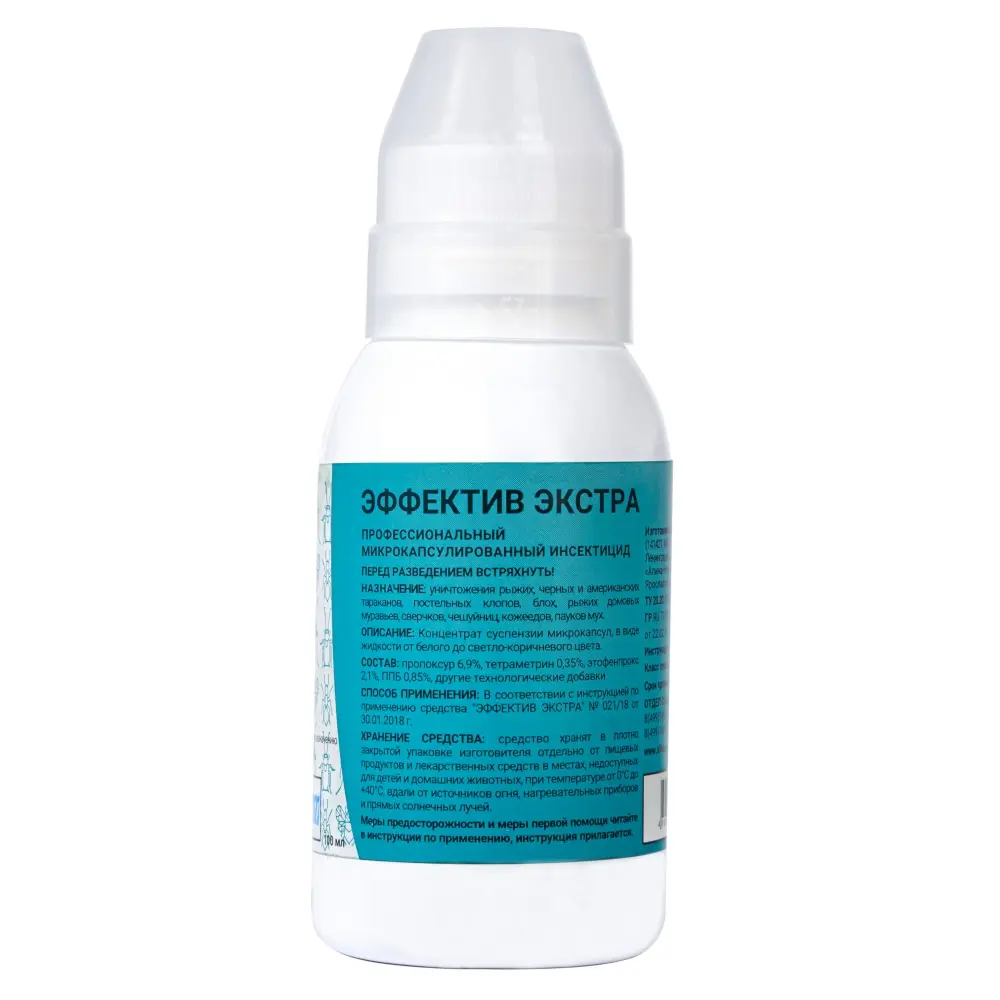 Инсектицидное средство Эффектив Экстра применяется для уничтожения широкого спектра домашних синантропных и уличных насекомых. Выпускается в виде концентрата суспензии во флаконе объемом 100 мл. Представляет собой микрокапсулированную непрозрачную жидкость белого или светло-коричневого цвета, практически не имеет запаха.