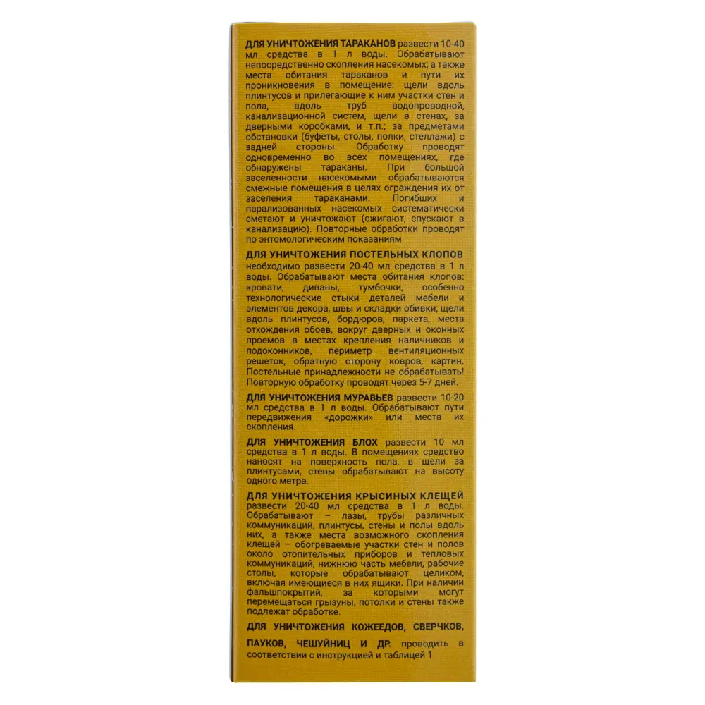 - От тараканов используют 40 миллилитров препарата на 1 л воды. Дезинфицируют область скопления вредителей, пути проникновения и миграции: щели, стыки коммуникаций, систему вентиляции, плинтус, мебель, изготовленную из ДСП. Погибших тараканов сметают и утилизируют. При необходимости обработку повторяют через 3 недели.