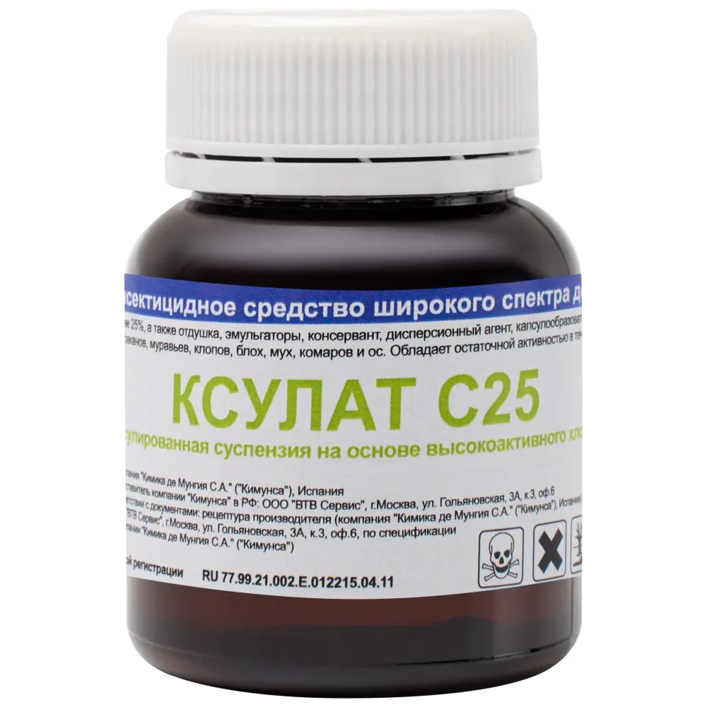 Ксулат С25 – инсектицидное средство, представленное в виде вязкой жидкости молочно-белого цвета. Отличается широким спектром действия, а главное – длительной остаточной активностью. В течение 5 – 6 месяцев он предотвращает повторное нашествие вредителей и на 100% уничтожает ранее появившихся особей. Микрокапсулированная формула заметно ускоряет дезинсекцию, при этом не оставляет следов на поверхностях. Также легко смывается и не портит в дальнейшем мебель. Подходит для применения на объектах различного назначения, включая жилые дома, административные учреждения. ЛПУ и магазины. Результат заметен уже после первой обработки.