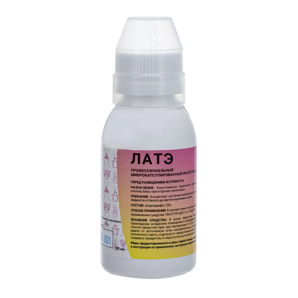 Микрокапсулированное средство Латэ имеет специфический запах. В невскрытой упаковке оно может храниться 3 года. Препарат эффективно действует против членистоногих, активно размножающихся в среде обитания человека. Его можно применять против тараканов, комаров и их личинок, кожеедов, чешуйниц, блох, клопов, клещей, мух и муравьёв. Период остаточного инсектицидного действия варьируется от полутора месяцев и может увеличиваться в зависимости от типа обрабатываемого объекта и вида насекомых.
