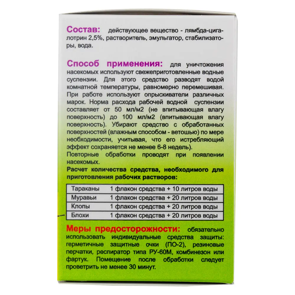 Средство относится к 3 классу опасности (умеренно опасное вещество). Перед распылением обязательно используйте средства индивидуальной защиты: резиновые перчатки, защитные очки и респиратор. На время обработки из помещения должны быть удалены люди и домашние животные. После завершения дезинсекции необходимо тщательно проветрить помещение и постирать вещи, контактировавшие с препаратом.
