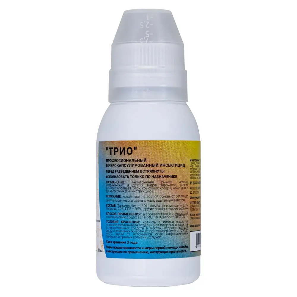 Препарат Трио — инсектицид в виде суспензии. Это концентрированная непрозрачная жидкость белого или бежевого цвета со слабым специфическим запахом.
