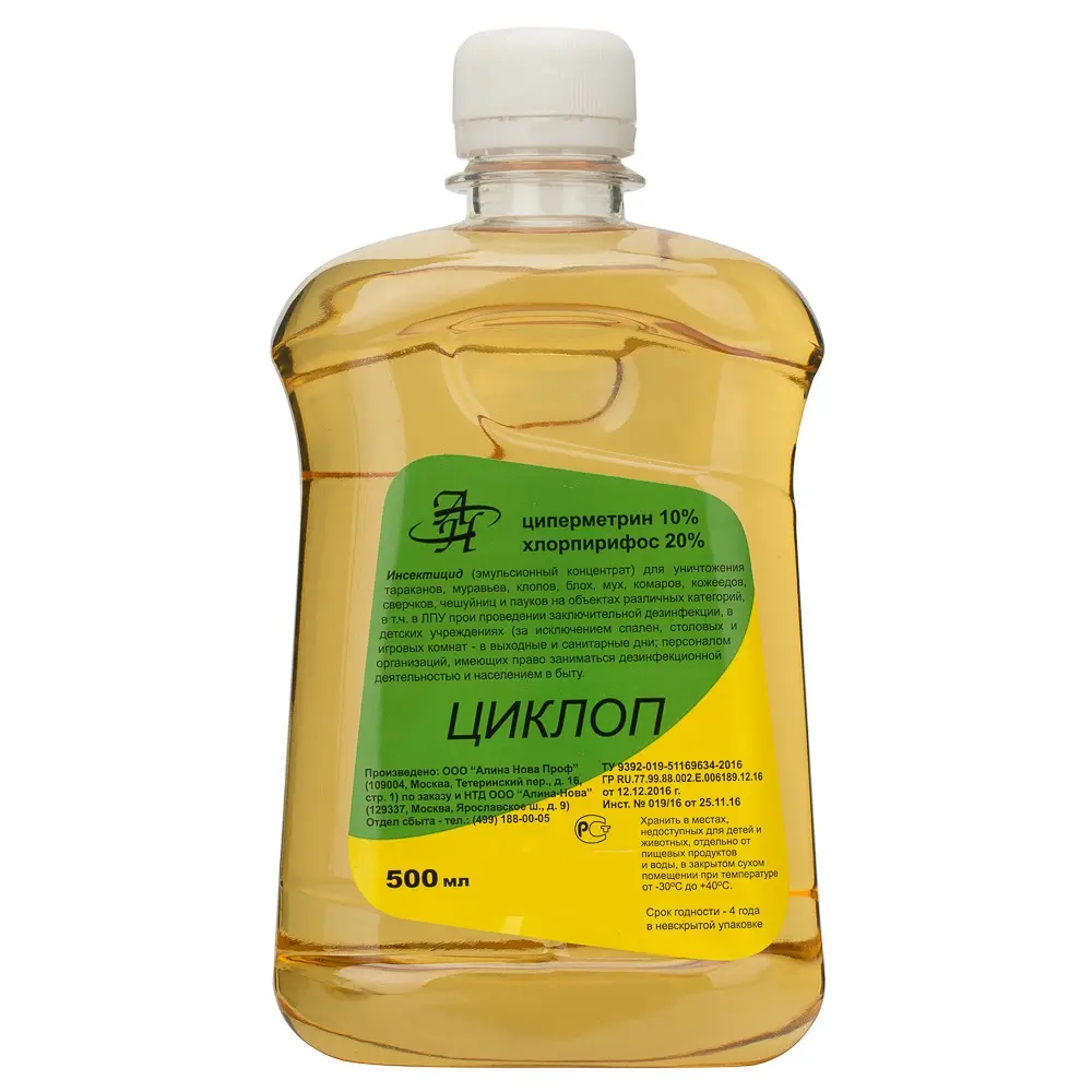 Сбалансированный состав подобран таким образом, чтобы компоненты становились залогом повышенной эффективности и в значительной мере усиливали действие друг друга. Предлагаем купить Циклоп, который состоит из 10% циперметрина и 20% хлорпирифоса.