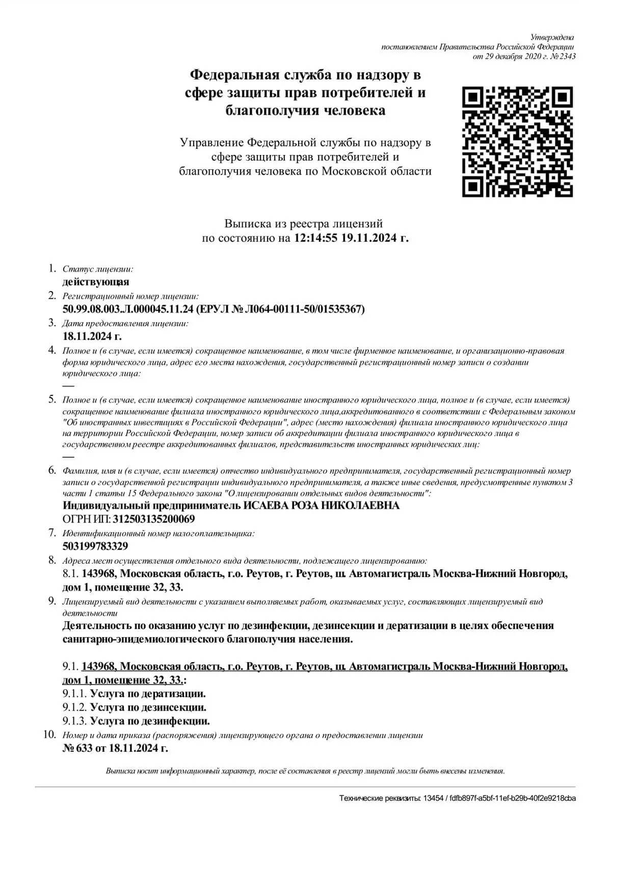 Наша организация прошла профессиональную подготовку и имеет свидетельство Национальной Организации Дезинфекционистов РФ (НОД). Мы предоставляем: договор на оказание услуг, акт выполненных работ, чек, сертификаты на препараты.